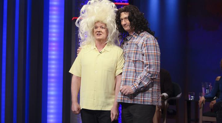 Wayne plays all members of 'N Sync, Chip Esten sings to an audience member as Rod Stewart & Tina Turner and Drew joins Props.